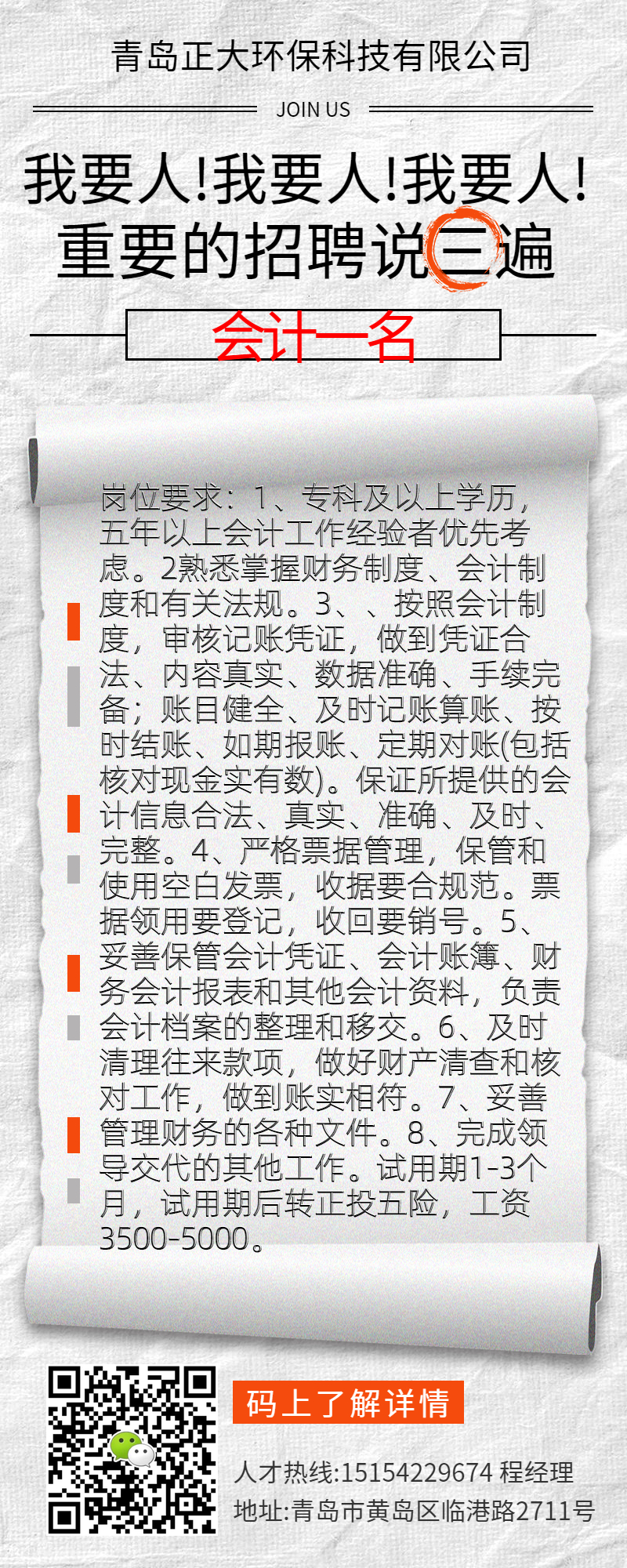 青島正大環(huán)??萍加邢薰菊衅笗?huì)計(jì)一名待遇從優(yōu),