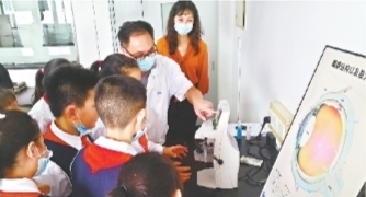 在實(shí)驗(yàn)室,光學(xué)檢測(cè)中心工程師郭小華拿著眼睛結(jié)構(gòu)示意圖,向?qū)W生們傳授保護(hù)眼睛知識(shí),“眼睛是一個(gè)極其精細(xì)的器官,要講衛(wèi)生,感覺(jué)眼睛癢或者干燥時(shí),不要用手去揉,是眼睛疲勞沒(méi)有休息好的原因,這時(shí)就要讓眼睛休息會(huì)兒”。