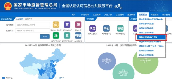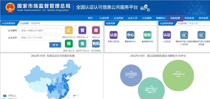 1.點(diǎn)擊進(jìn)入“全國(guó)認(rèn)證認(rèn)可信息公共服務(wù)平臺(tái)”,打開“首頁(yè)”,可看到右上方“檢驗(yàn)檢測(cè)”欄。