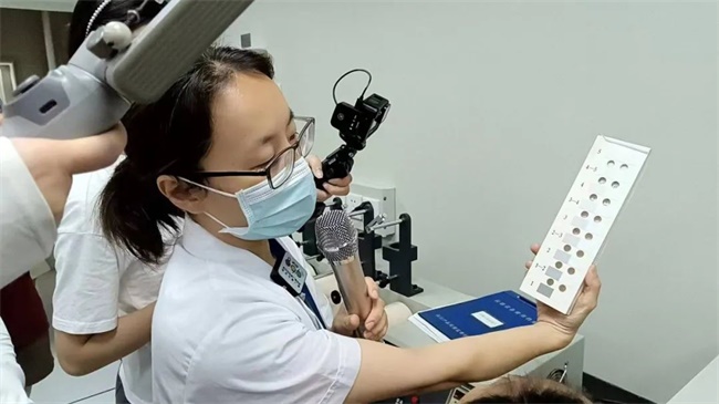 檢驗員小姐姐模擬生活中的摩擦現象,用白色棉布的沾色程度來考察服裝的褪色情況。