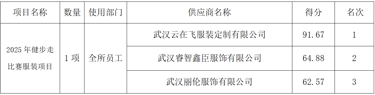 武漢產品質量監督檢驗所工會小組于2025年1月24日上午,組織了“健步走比賽服裝采購項目”采購競爭性談判,結果公示如下: